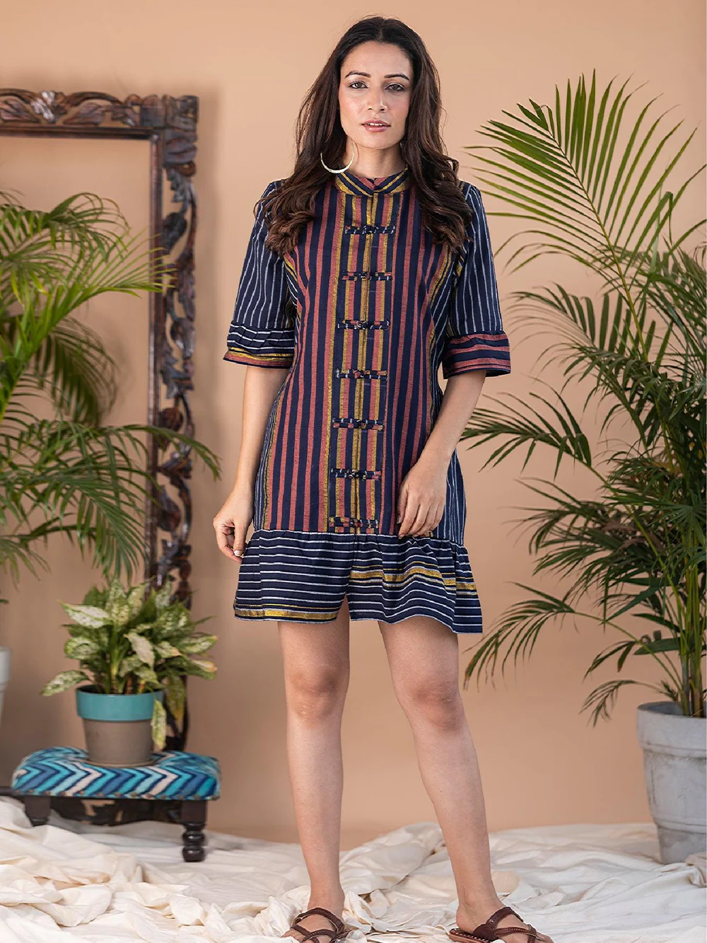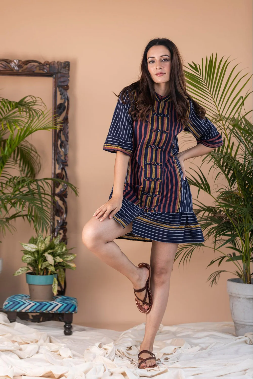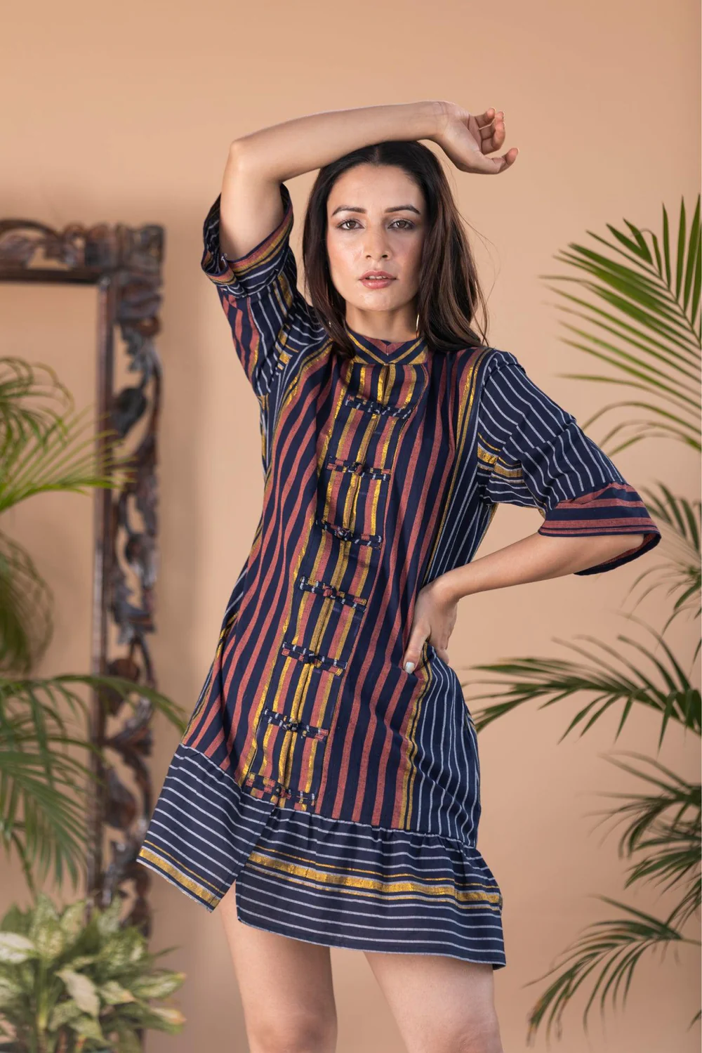 Kaira Navy Blue/Peach Stripes Mandarin Collar Dress
