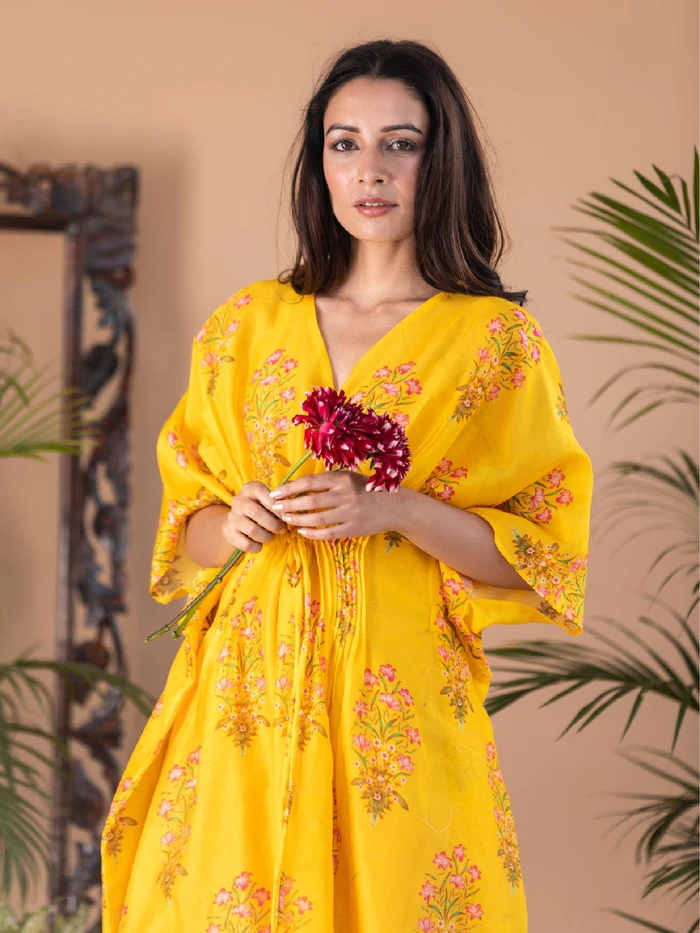 Liba – Yellow Block Print Pintuck Kaftan
