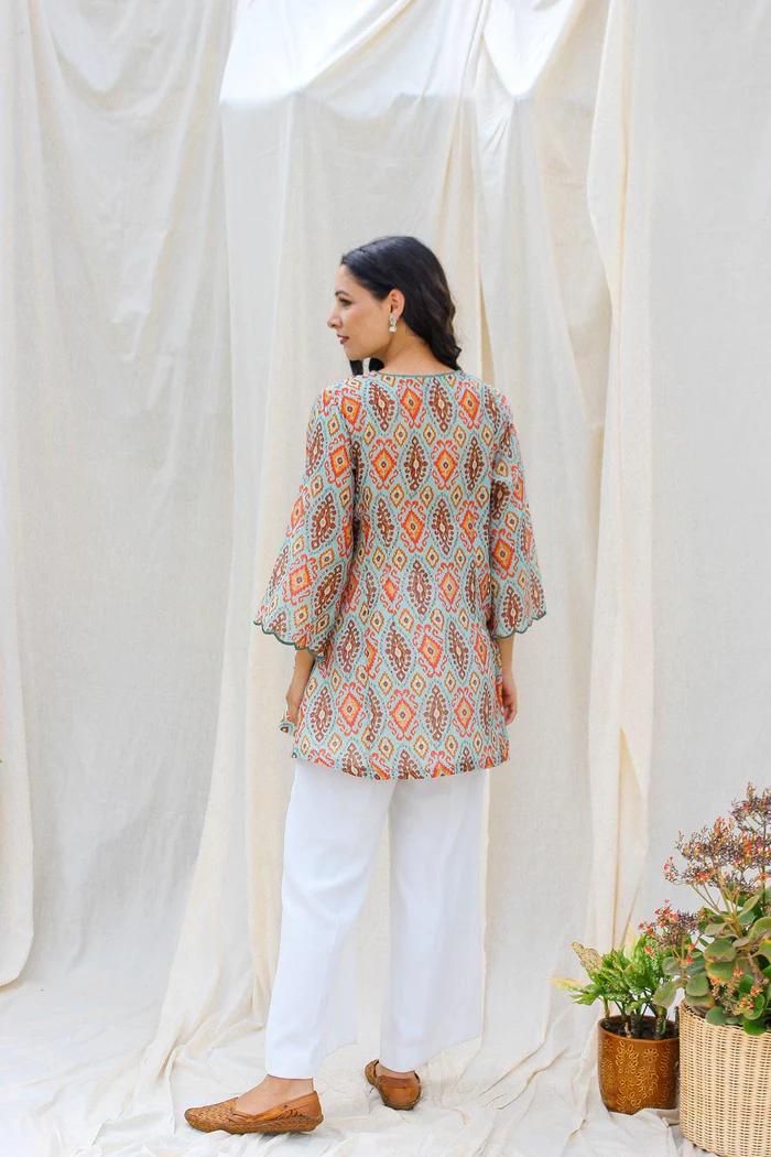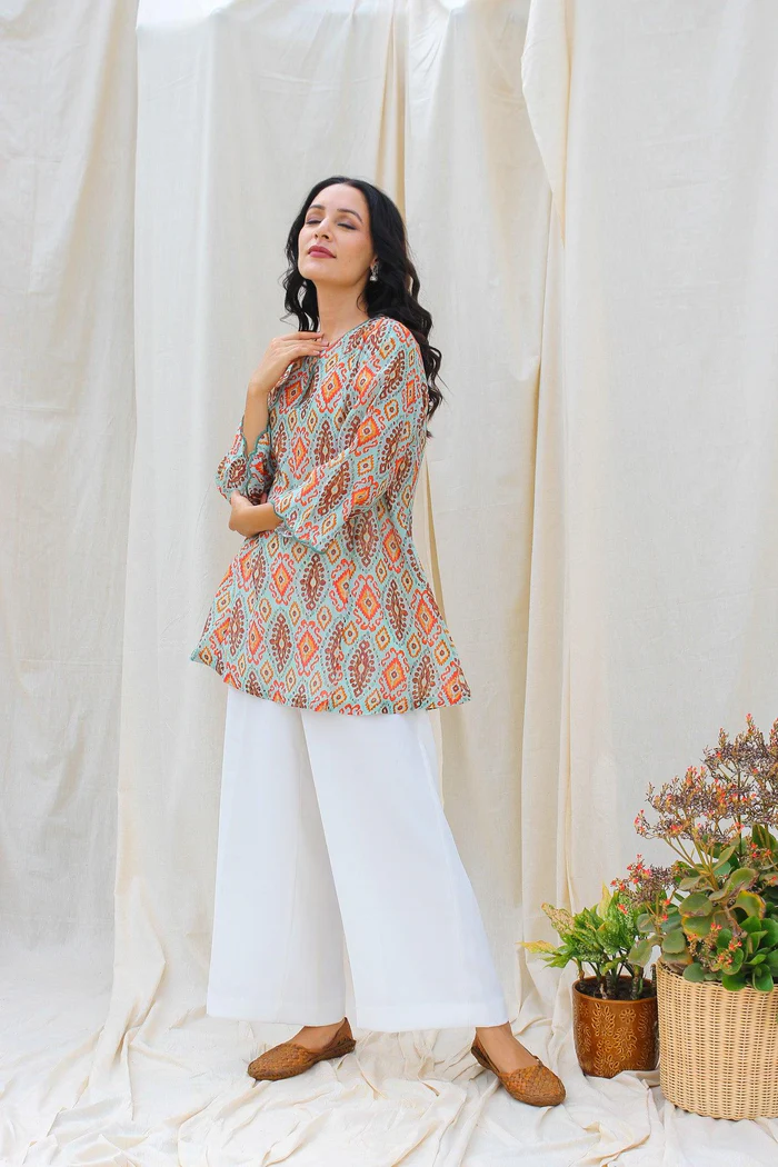 The kurta features a flattering silhouette with subtle detailing, such as a delicate neckline and tailored fit, ensuring both comfort and style. Pair it with white or pastel leggings, palazzos, or trousers to complete the look. Ideal for festive events, family gatherings, or a stylish day out, the Mint Ikat Printed Chanderi Kurta is a versatile addition to any wardrobe, embodying grace and sophistication with every wear.